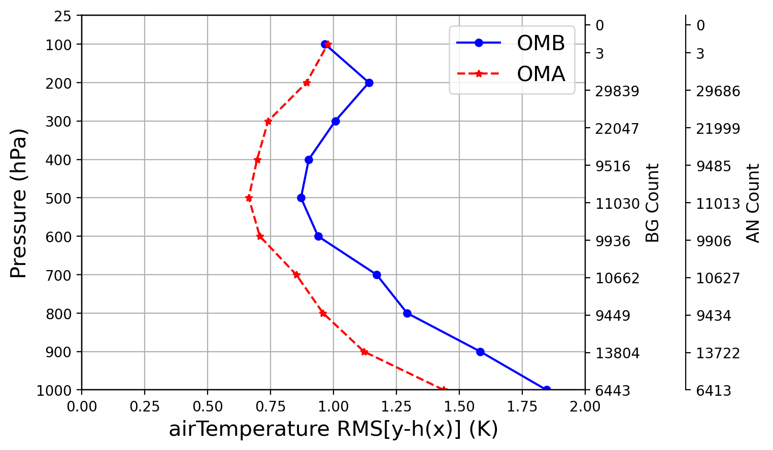 In this section, we will make plots for the statistics of OmB/OmA feedback files from two 2-day cycling experiments by using the graphics package. In order to do this, we first generate observation-space statistics following the instructions in Section 7.1, then create the plots from statistics files following the instructions in Section 7.2.