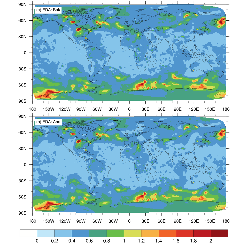 With the plot_eda_ens_spread.ncl, we can plot the ensemble spread of both background and analysis. Similar to the ensemble mean increments, just change the diag_var and diag_lev in the NCL script, and run plot_eda_ens_spread.ncl:
