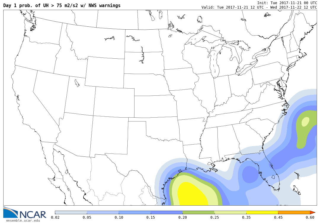 Ensemble surrogate severe probability forecasts (E-SSPFs) are produced using Gaussian-smoothed (sigma=120km) ensemble probabilities for an event (e.g. UH>75 m2/s2) occurring any time within the specified time period within 25-mi of a point.