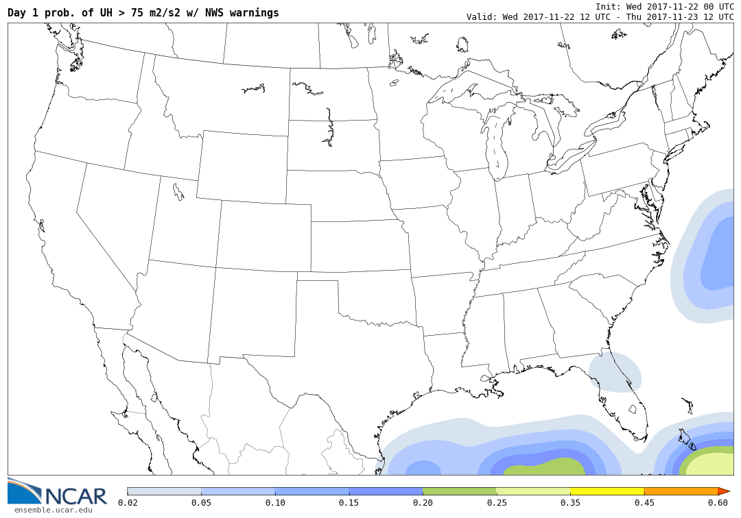 Ensemble surrogate severe probability forecasts (E-SSPFs) are produced using Gaussian-smoothed (sigma=120km) ensemble probabilities for an event (e.g. UH>75 m2/s2) occurring any time within the specified time period within 25-mi of a point.