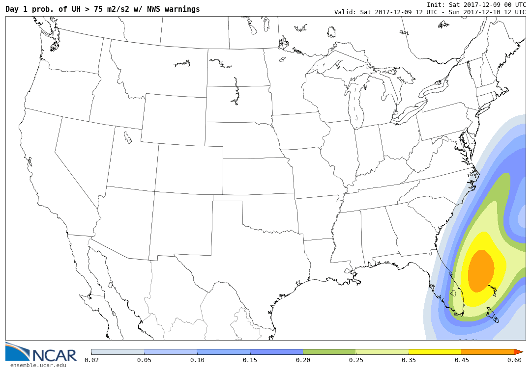 Ensemble surrogate severe probability forecasts (E-SSPFs) are produced using Gaussian-smoothed (sigma=120km) ensemble probabilities for an event (e.g. UH>75 m2/s2) occurring any time within the specified time period within 25-mi of a point.